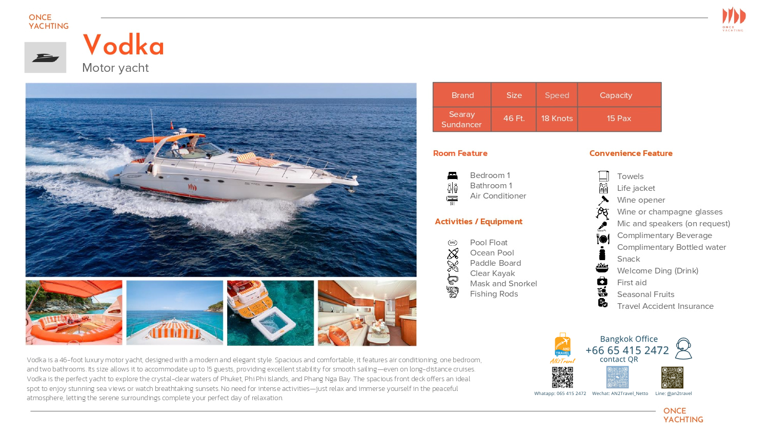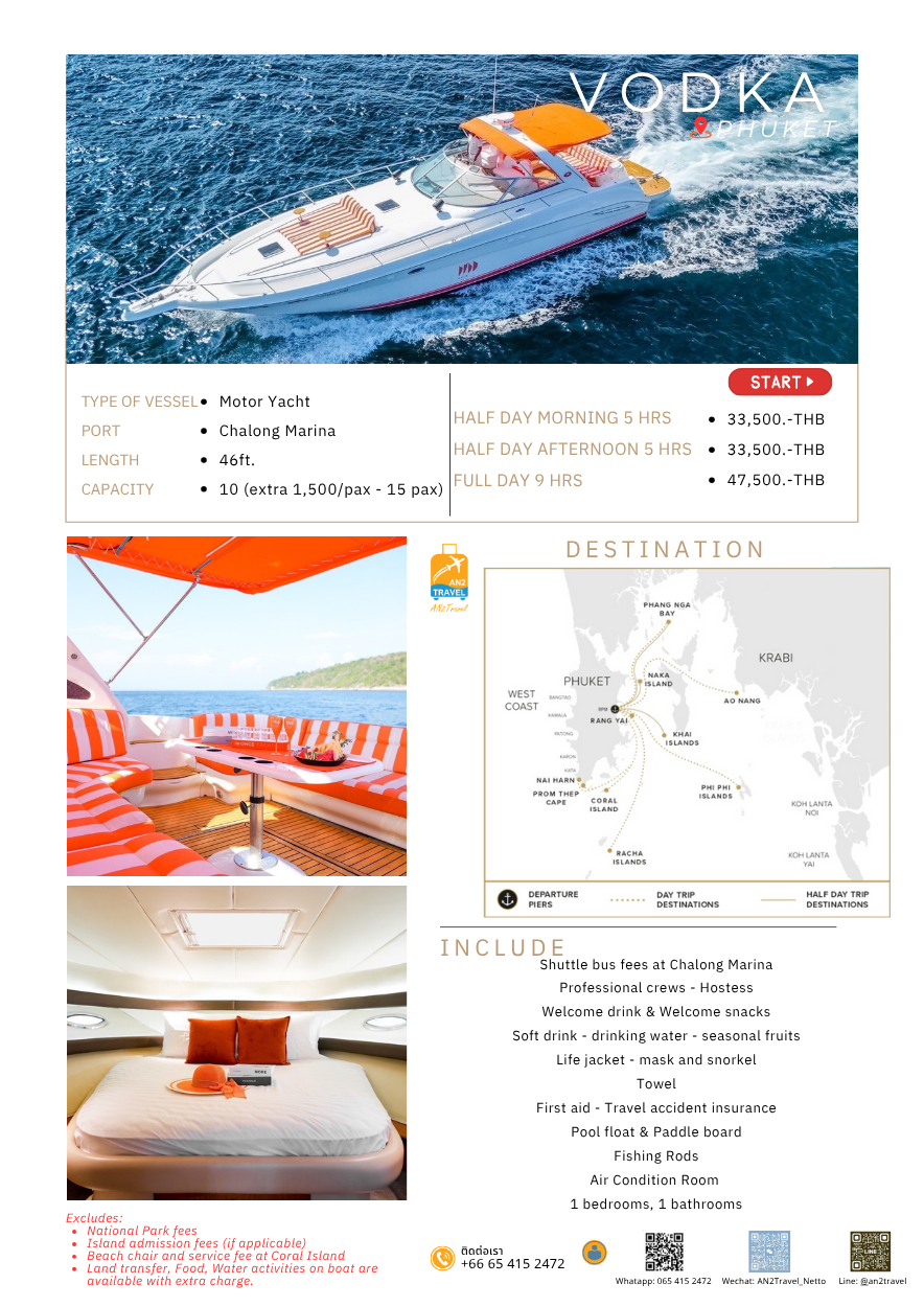ราคาปรับเปลี่ยน ตามจำนวนคนที่ขึ้นเรือ เรทปรับเปลี่ยนตามโปรแกรมการเดินทาง และช่วงเวลา การออกเรือ กรุณาติดต่อบริษัท เพื่อเช็คราคาต่อจำนวนคนที่ท่านต้องการขึ้นเรือ